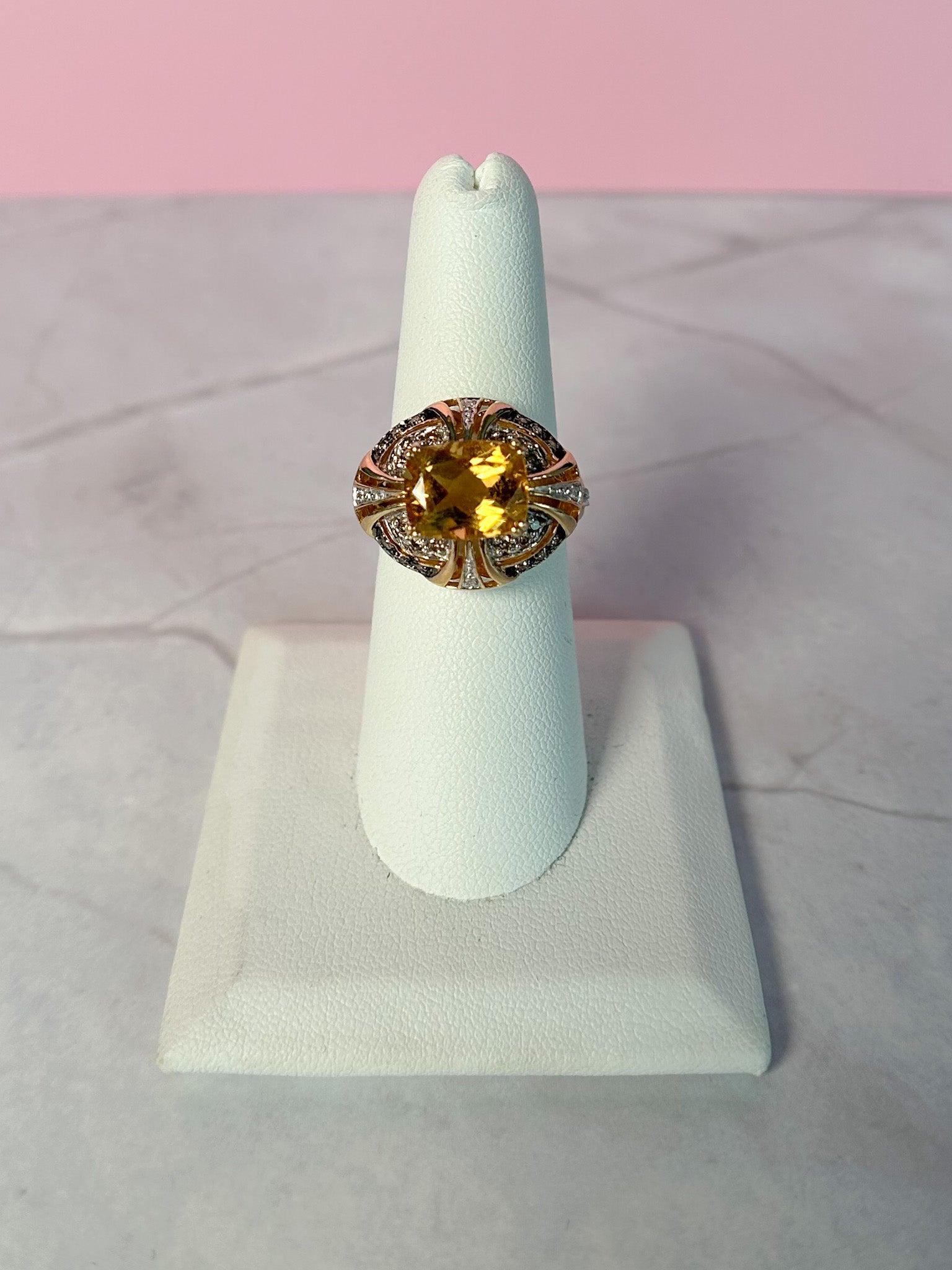A large, central golden topaz is surrounded by clusters of diamonds on the setting. The stone and diamonds sit on a 14k golden woven basket. The ring is size 6&1/2 but could easily be resized.